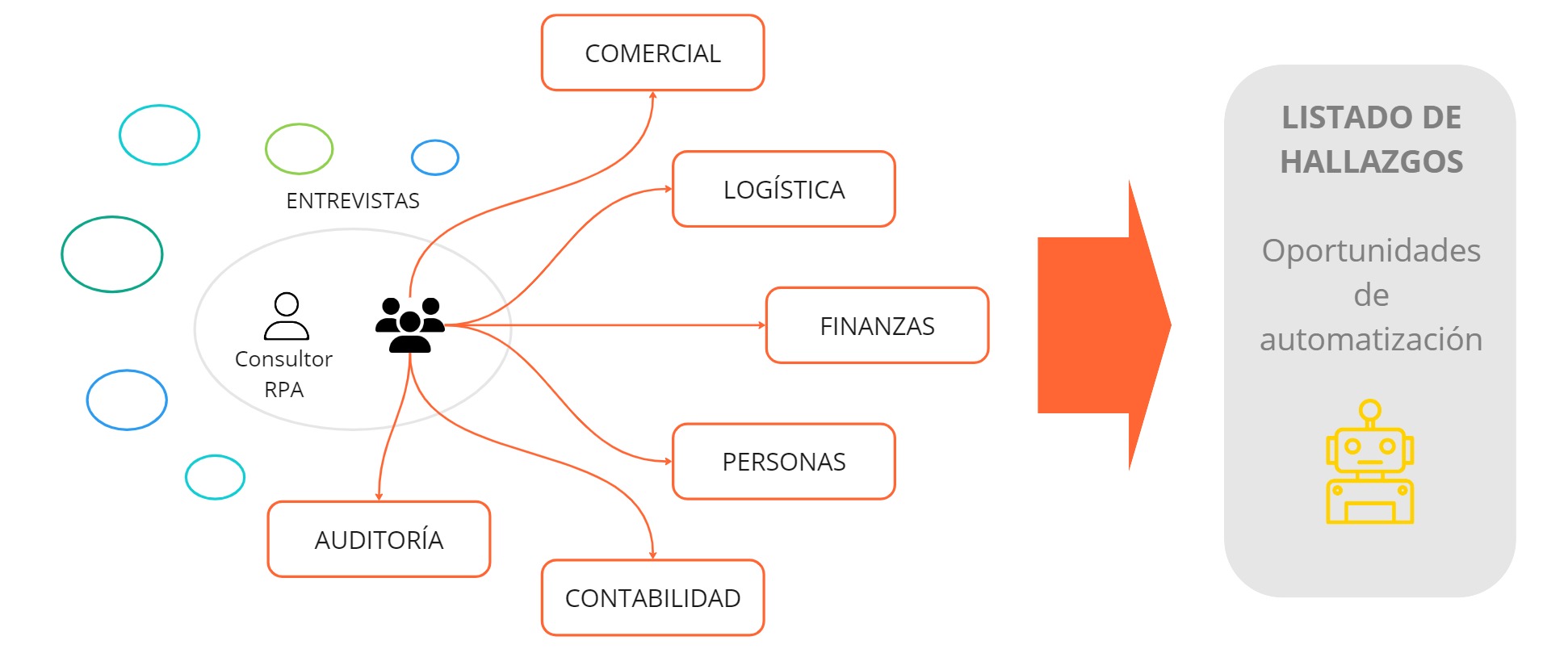 Sostenemos entrevistas transversales con la mayor cantidad de áreas organizativas, les mostramos ejemplos de uso y analizamos cómo realizan hoy tareas manuales repetitivas de registro y consulta de datos. Con ello descubrimos oportunidades de automatización que listamos y posteriormente ayudamos a priorizar junto a los clientes.